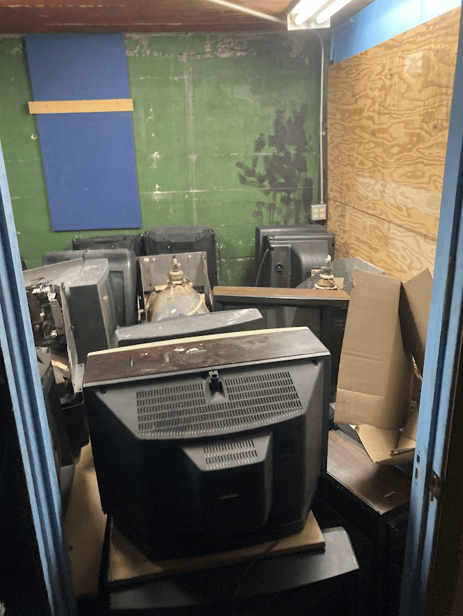 This is our room filled with junk tvs. We sometimes steal parts from them to keep arcade games going.