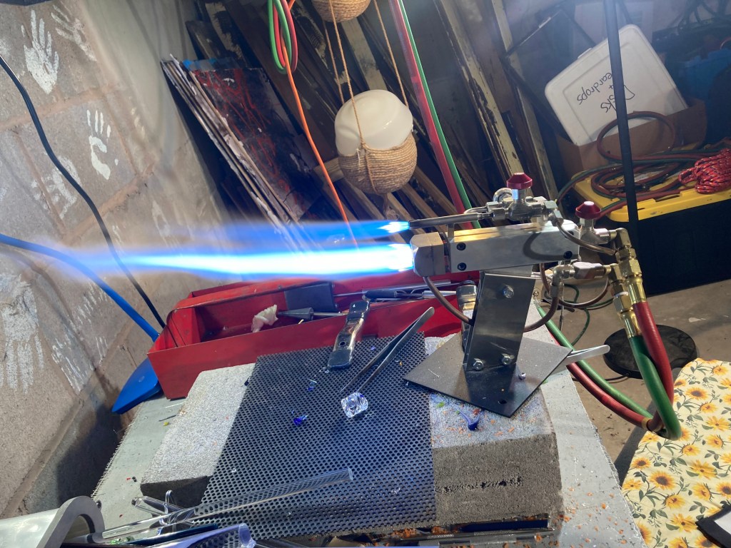 There have been 3 major updates to my glass studio this month. First, I placed my first large order from a glass supplier. I ordered various sizes of hollow glass tubes, as well as some fun colored solid glass. All rods and tubes were 4.5ft in length, and the box I ordered weighed about 75 pounds. Having all this glass on hand enabled me to play around with bending and blowing out tubing without having to worry about running out, or spending a ton of money ordering more. Secondly, I got a new torch. Previously I had been using a national 3AB (right) hand torch, which is a great torch for small work but is mostly meant for cutting metal, not melting glass. I upgraded to a Nortel Midrange Plus (left). Here is a comparison of the torches…
