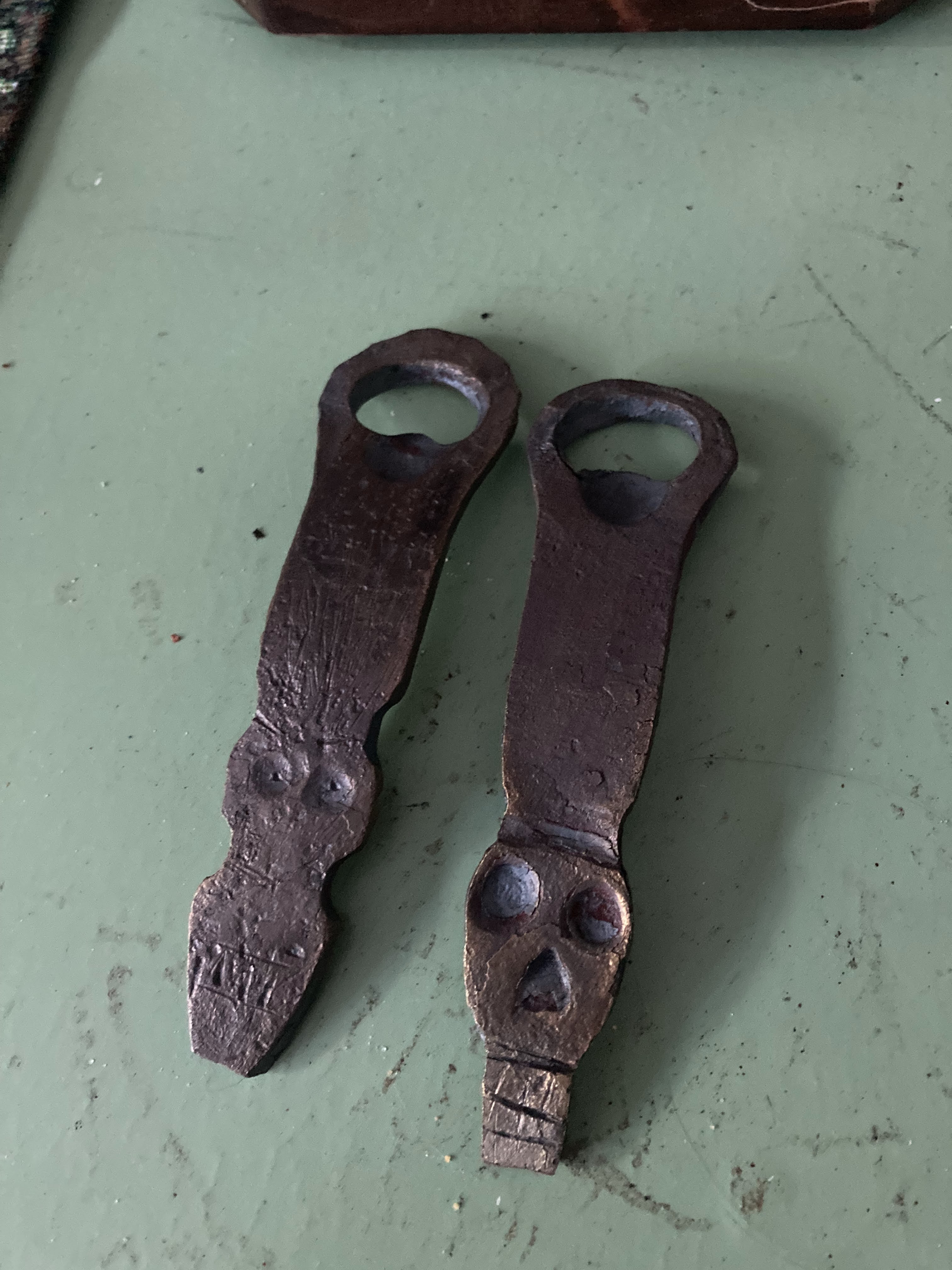 Skull bottle openers made at a blacksmithing couples date night that Vera and I went to. Left was made by me, right was made by Vera.